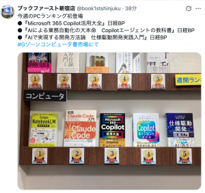 本書の校正にも深く携わった当社取締役CTO 冨永 善視も、発売後みずからブックファースト新宿店へ足を運び、棚に並ぶ本書を確認しました。冒頭の写真は、ブックファースト新宿店様がX(旧Twitter)にてご投稿くださったものです。